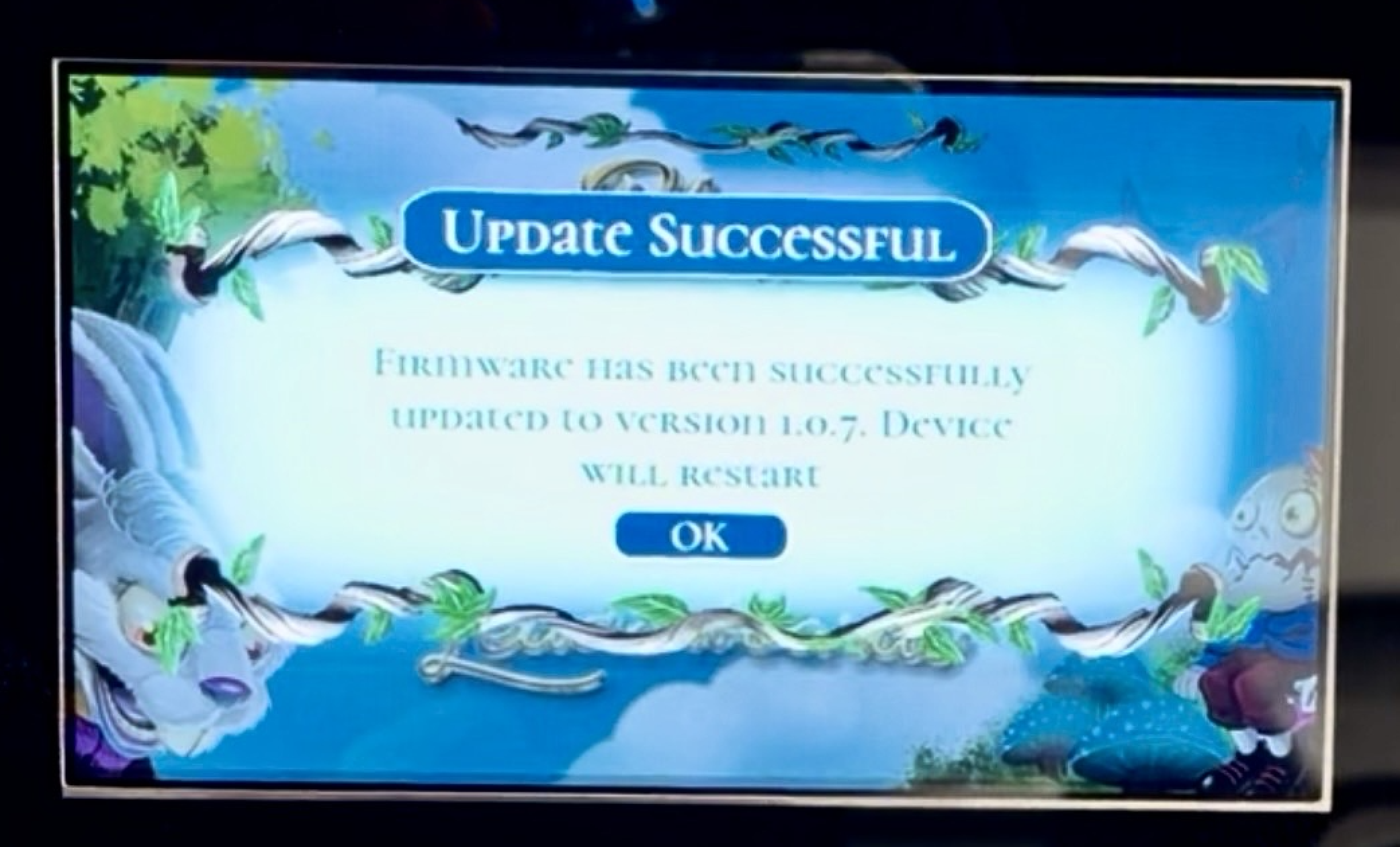 “Update Successful – Firmware has been successfully updated to version 1.0.7. Device will restart.”